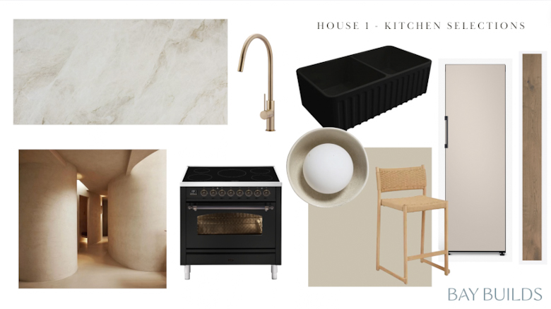 For finishes, House 1 Kitchen has a light colour scheme that is juxtaposed with darker selections including a black oven, sink and of course the black window frames that are present throughout the build. When it came time to selecting the stone we locked in Cosentino Sensa ‘Taj Mahal’ for the both the benchtops – including a splashback – and the rangehood. At one of our site visits, the Edstein team suggested that we curve this rangehood which was such a genius idea and a credit to their passion and craftmanship. These rangehoods have since become a favourite element of these kitchens!