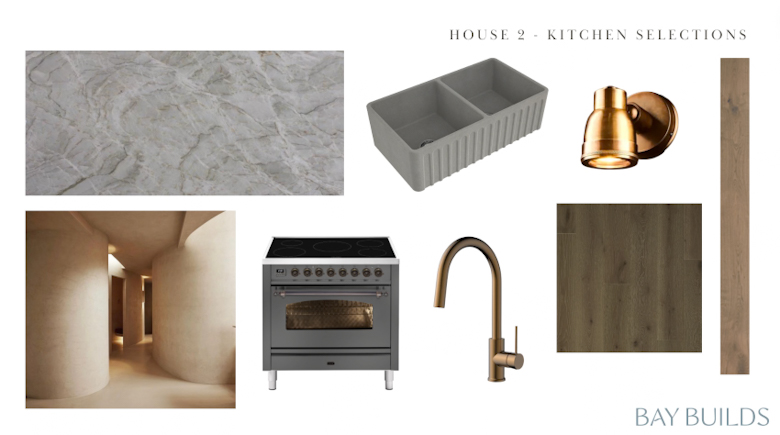 Over in House 2, the most obvious difference between the two kitchens is the darker palette of the cabinetry, and the stone selection. The majority of this cabinetry is Aged American Oak by Loughlin Furniture and on the island we’re using Taubmans ‘Time Capsule’. The Cosentino Sensa ‘Vancouver’ stone pairs beautifully with the copper tapware range from Beaumonts that we’ve used throughout the build in this home.