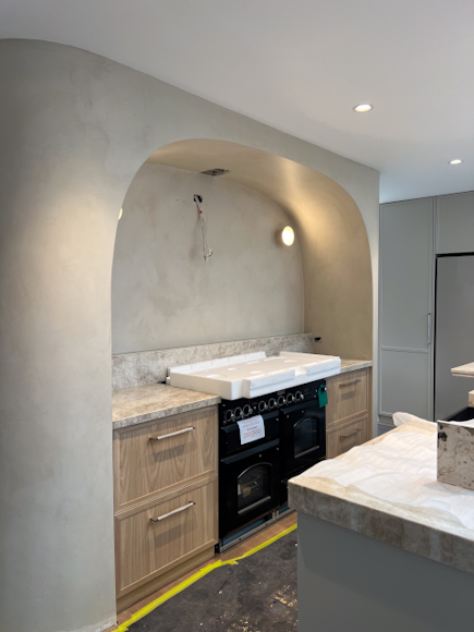 Opposite to these doors we’ve designed a curved wall for the oven, rangehood and cabinetry to sit within. They create a stunning focal point for each kitchen, and we thought it would be a nice touch for the Cemher microcement finishes that run along each hallway to be used here. In House 1 we’ve used Cemher El Àlamo 01 and in House 2, El Àlamo 02.