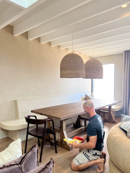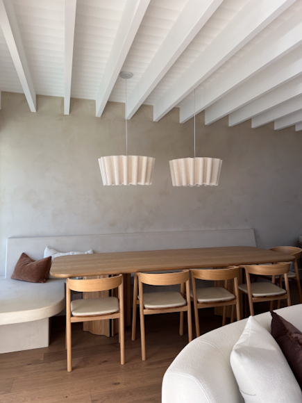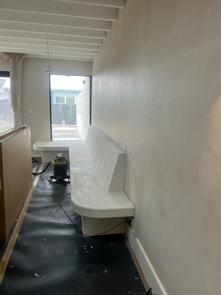 We’ve always found a built-in bench seat saves on floor spaces whilst also creating a point of interest. So for these homes we have designed and built an L-shaped seating area and finished it off by continuing the same microcement treatment that runs along the hallway walls. The backrest angle was Kyal’s decision and he’s nailed it – everyone who sits here finds it so comfortable.