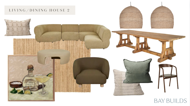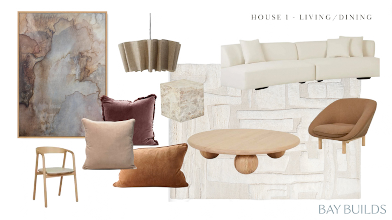 Initial Globe West furniture mood board for House 1 featuring art from Olive et Oriel and a Miss Amara rug