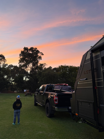 Here we parked the Lotus Caravan on the Ridge Campsite. A great spot right on the sand dune. We left our inflatable boat on the beach all week which made for some great, easy access fishing and snorkelling. The kids and Kyal caught PB squids, and we enjoyed a fire at the campsite each night. We also did a day trip into Coral Bay on a bad weather day to enjoy a barista coffee and a pub meal.
