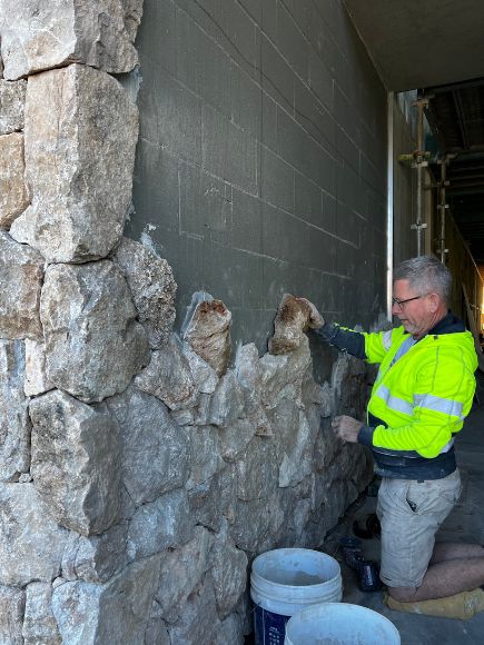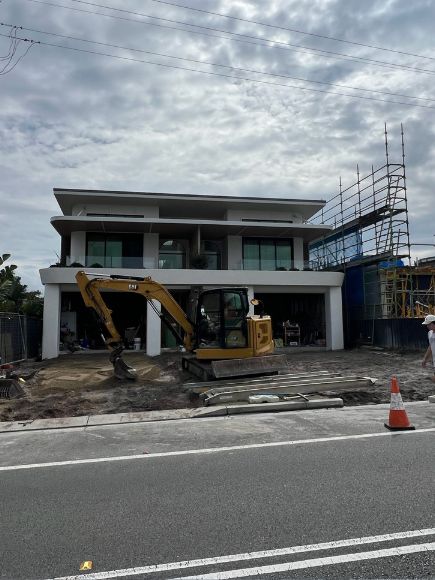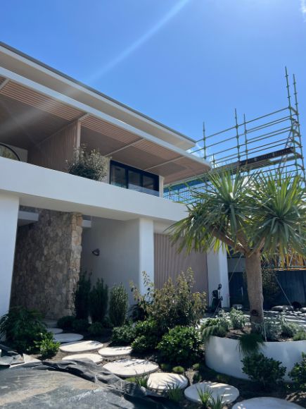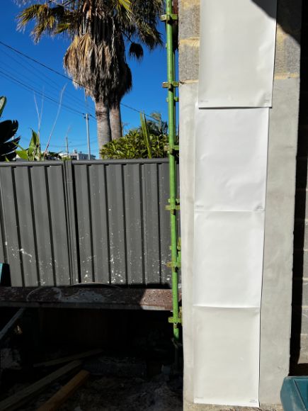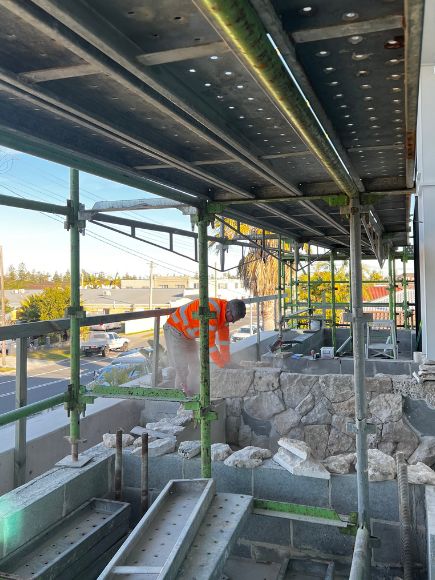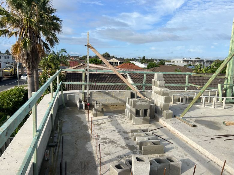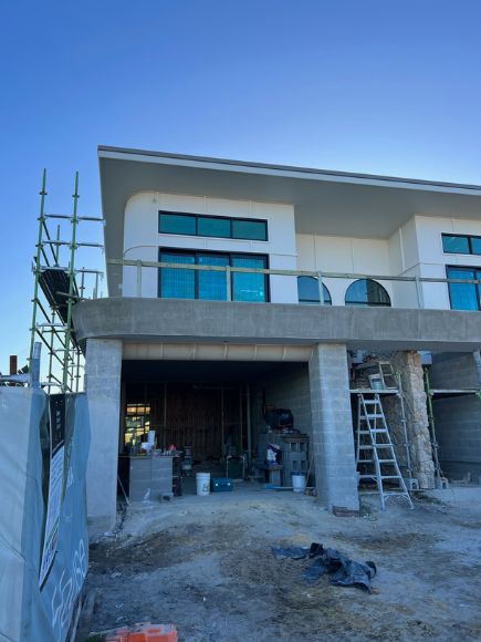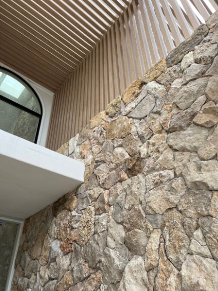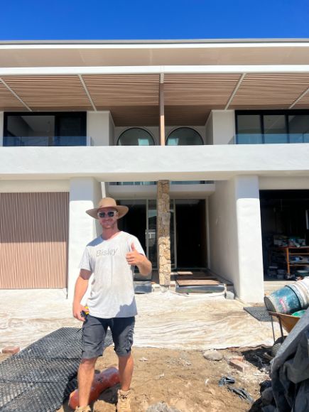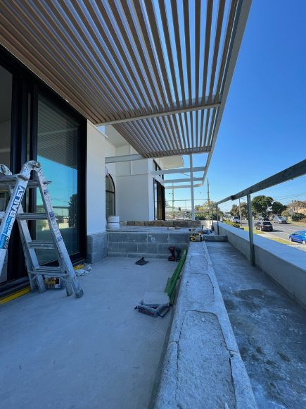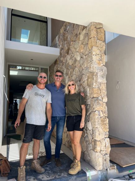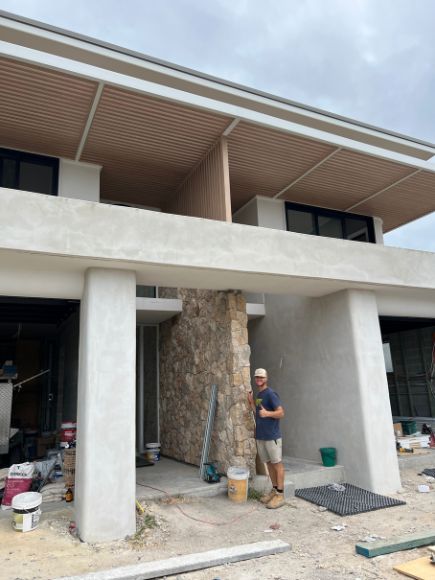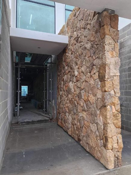 To achieve our ‘wow’ factor we wanted to use a combination of materials working together to tell the story of what we feel makes a ‘modern coastal’ home. One of the main features of the front facade of Bay Builds is the curved (and splayed) concrete garden bed that spans the width of the upper levels of both homes. We have block work below this that will be rendered, and a common wall between the two homes that will be clad in the Cathago random wall cladding from Stone Style.