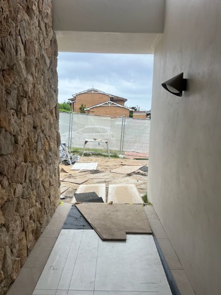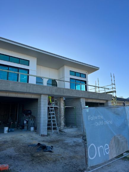 It’s at this stage of the build where we can really see the exterior finishes coming together. One of the first decisions we had made was the black window frames from the Wideline Paragon range and seeing them installed with the minimalistic look of the Hardie™ Fine Texture Cladding really helps to create a strong impact, especially the central arched windows at the entry of each home.