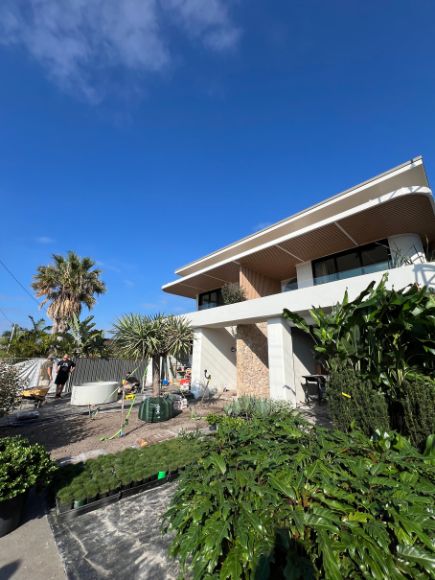 The day the plants are delivered is such an exciting day for us! It’s the icing on the cake for any project. Landart has completed the plant list and seeing all the plant varieties sitting together is a visual feast. The focal point for the front gardens is the Dracaena Draco from Margaret River Trees, and we’ve had a 1500mm cor-ten steel ring made up which we’ve painted. This helps to elevate the tree and provide a nice distinction between the two homes without the harshness of a solid wall.
