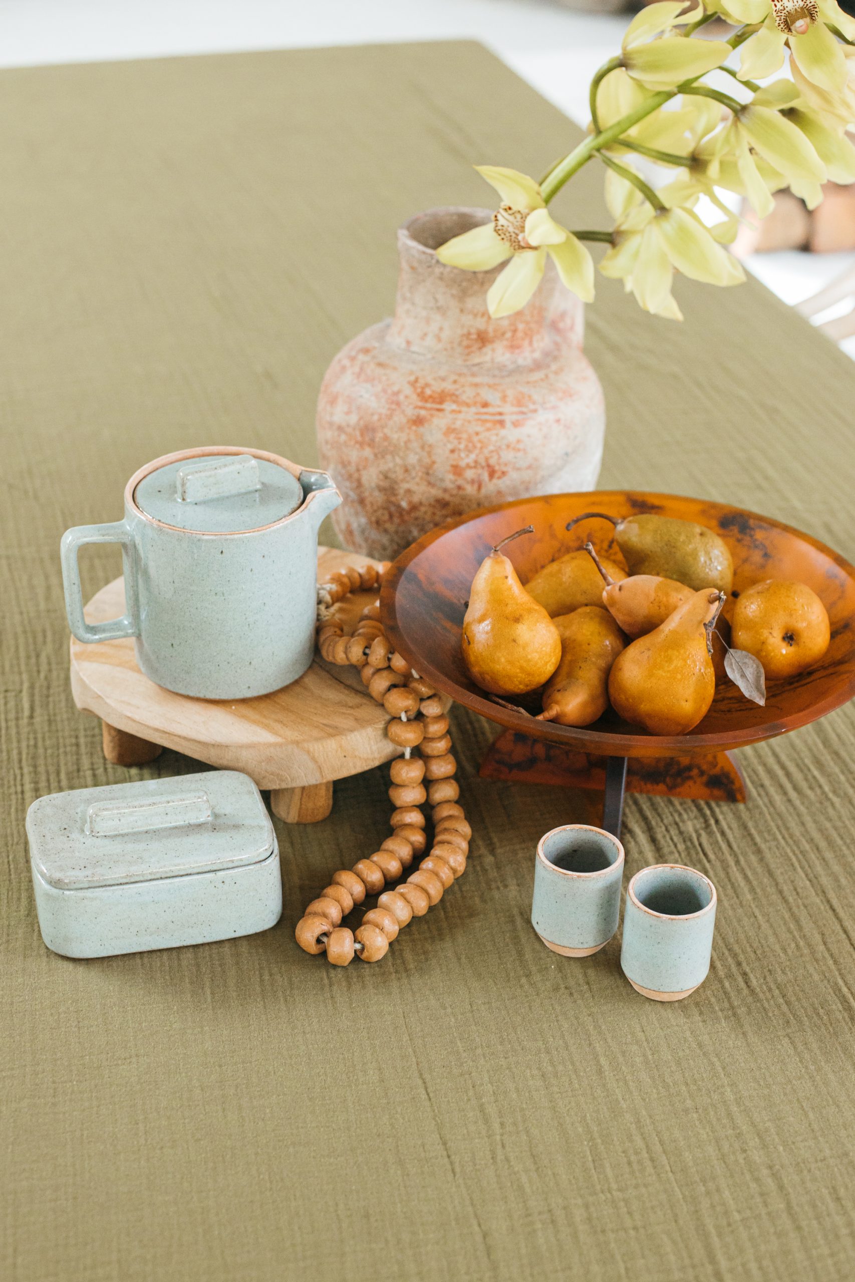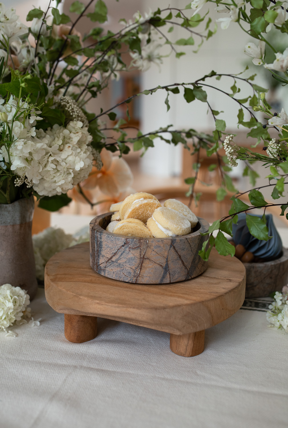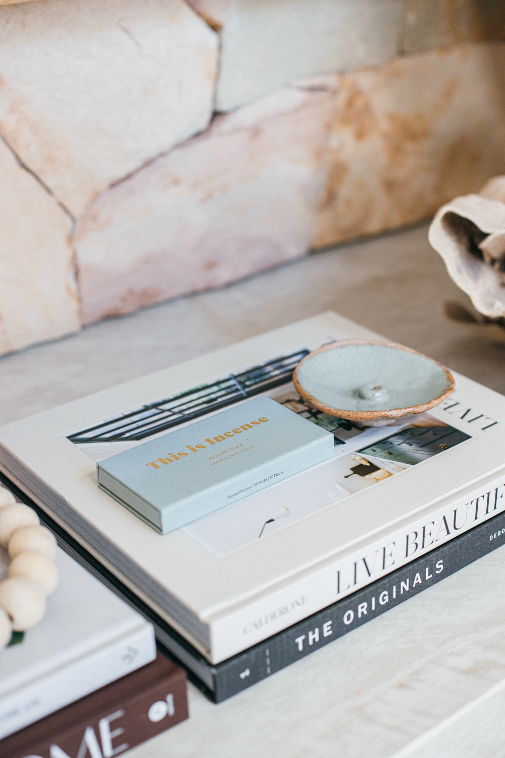 - Add a timber or stone tray or platter to the coffee table and style with books, candles and some dried or fresh winter foliage. At our house, these pieces often double as the perfect way to serve cookies and treats when we’re entertaining in the cooler months.