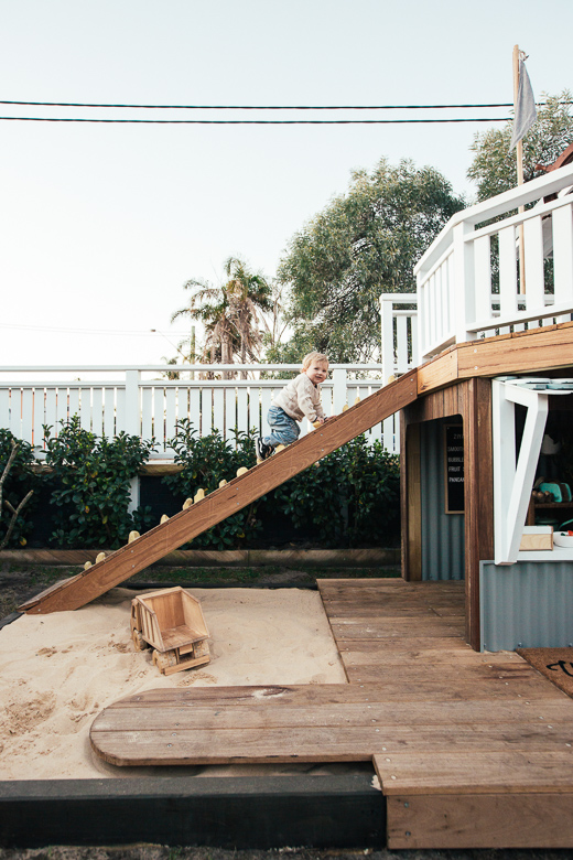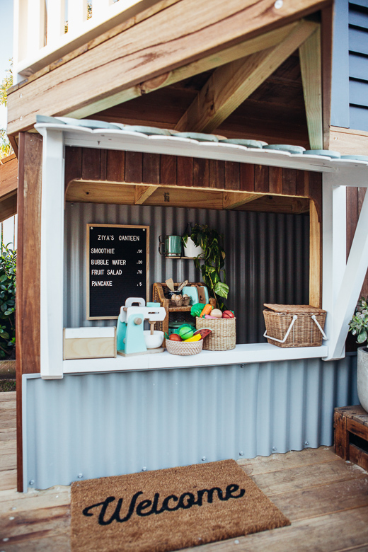 The bottom level of the cubby is set up as Ziya’s kitchen, he just loves it. However, I’m hoping he will expand on his menu in the near future! The cute little servery awning was made from weatherboards and offcuts of pine. Kara wanted to paint them alternating colours and it’s such a great little feature.